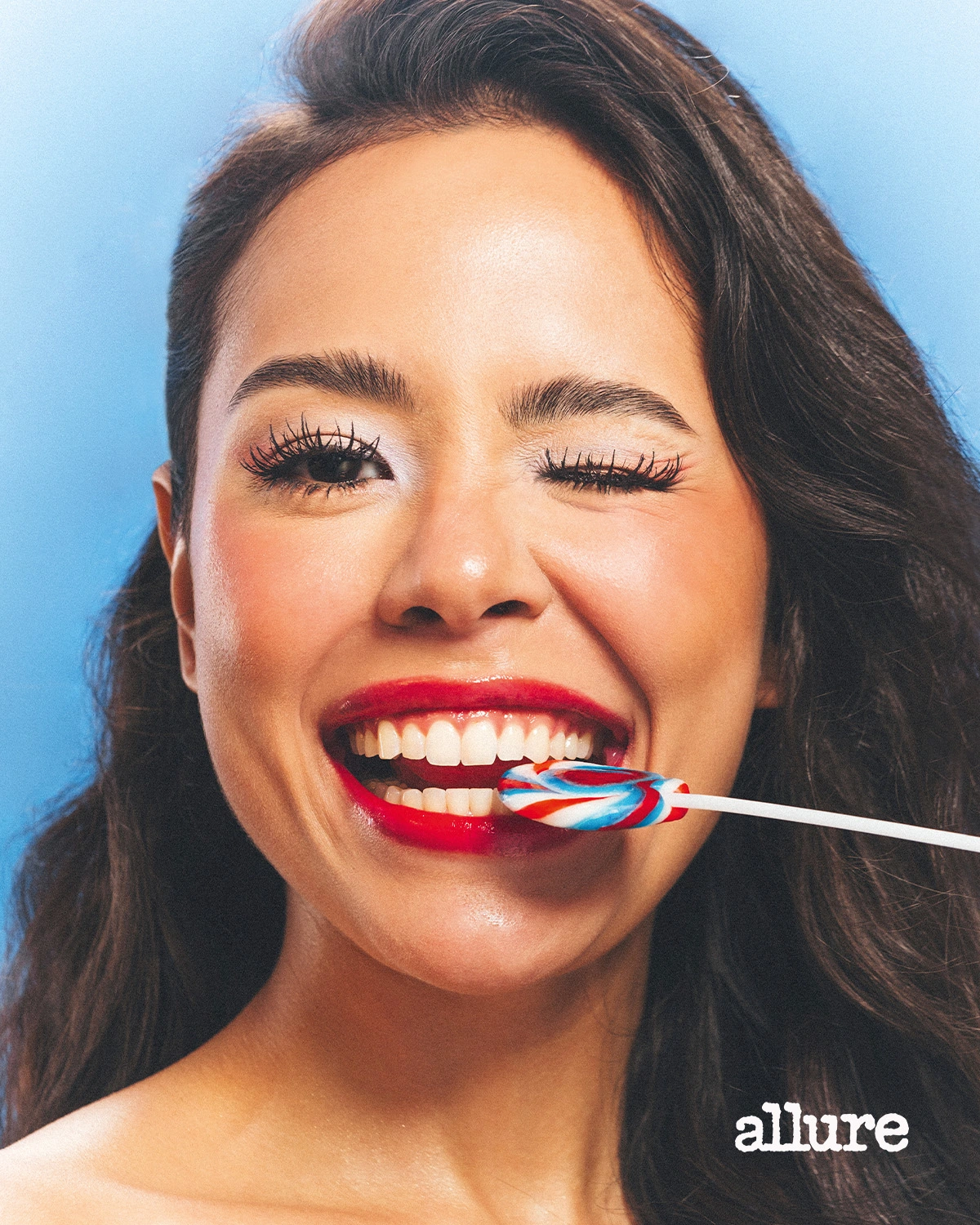 Inspired by ice scramble and sticky sweets melting in the summer sun, this colorful look is a statement for daytime events. To make the blue eye shadow pop, Cleto used a white primer, then dabbed a bright blue shadow on top. “Use a dabbing motion instead of a swiping motion,” she advises, so that the pigments stick. To create a cohesive look, make sure all your color cosmetics—blush, lipstick, and eye shadow share the same undertone.