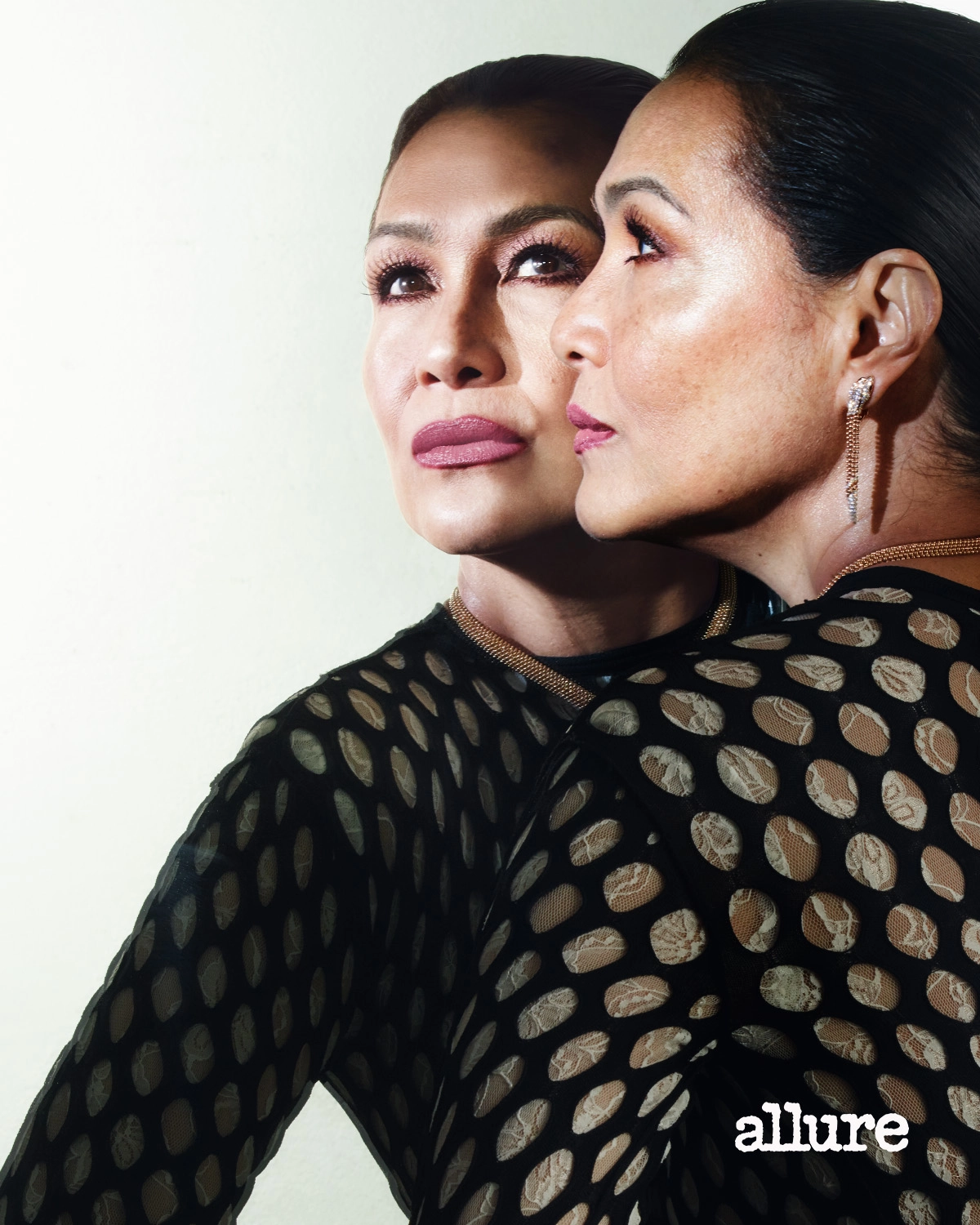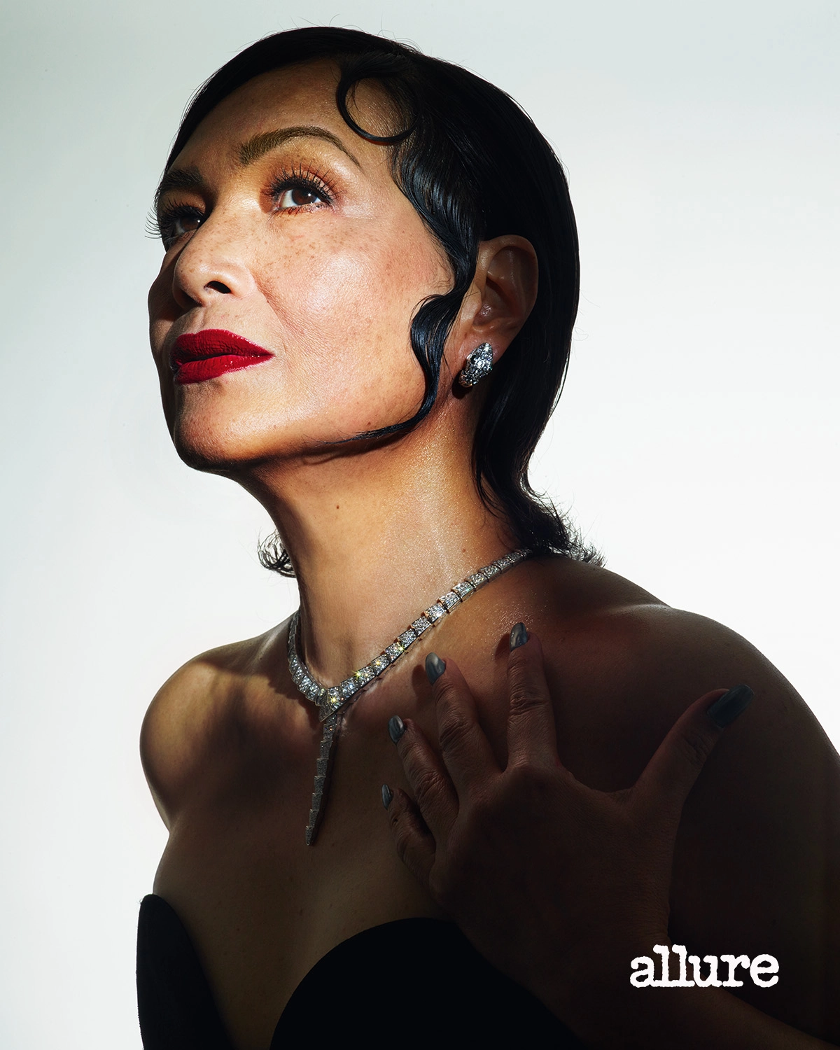 A vampy lip—a deep, dark red shade that’s almost black—is an homage to the 1920s. Giving this look a modern spin, Maristela Ocampo stuns in a dark lip with a high-frosted center, proving that glamour doesn’t get lost with time. To balance the bold makeup look, Flores made sure to start with a radiant base: “Prepping mature skin for makeup is all about hydration.” She suggests using products, such as rose water and a rich, emollient moisturizer.