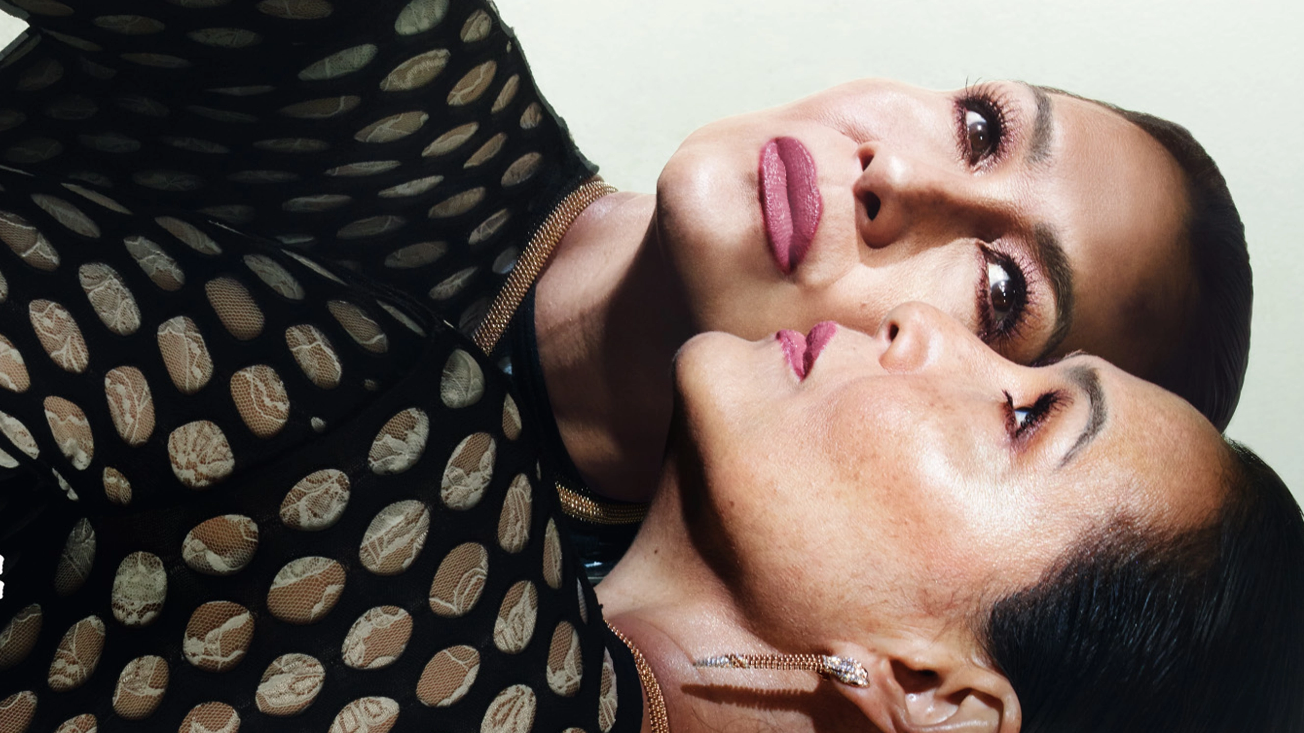 Bvlgari Gold Serpenti Necklace, bracelet, and earrings. Pam Denise Atelier White Lace Bodysuit. Dion Lee Black Netted Dress.