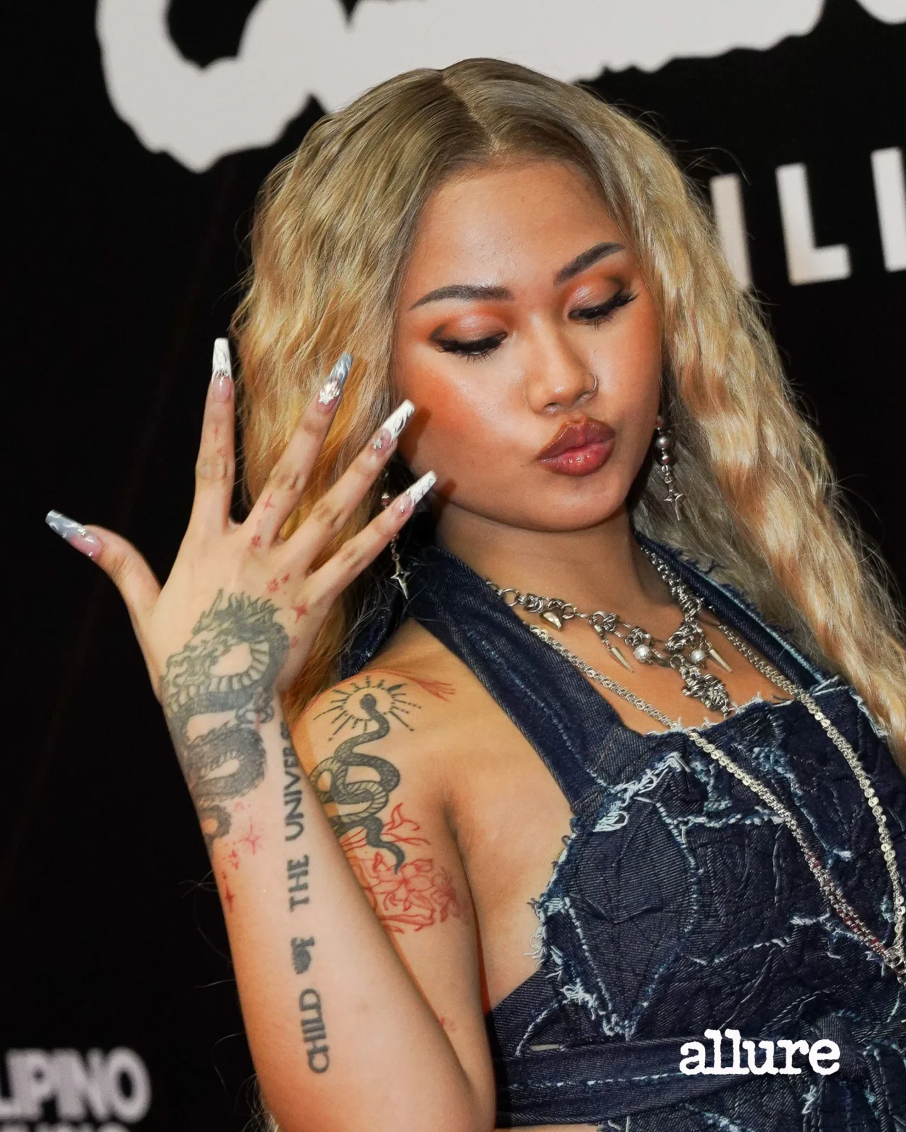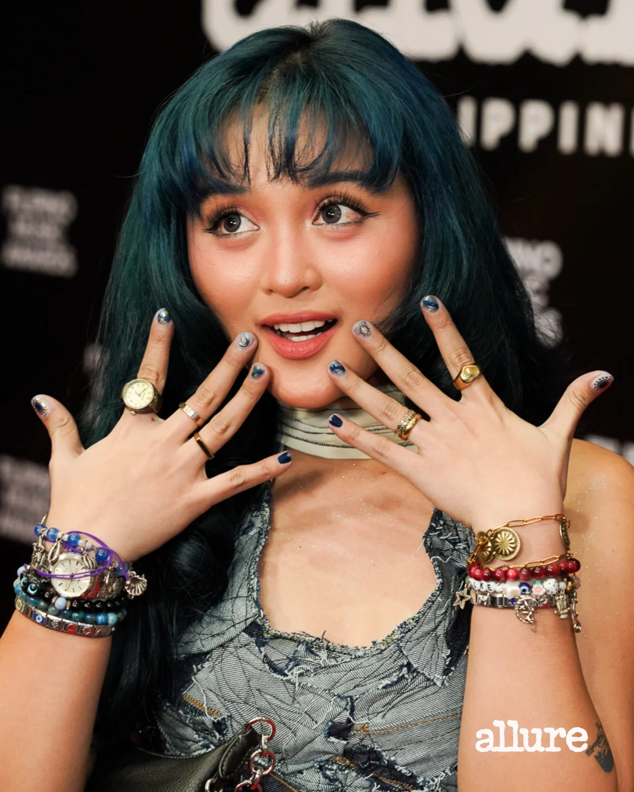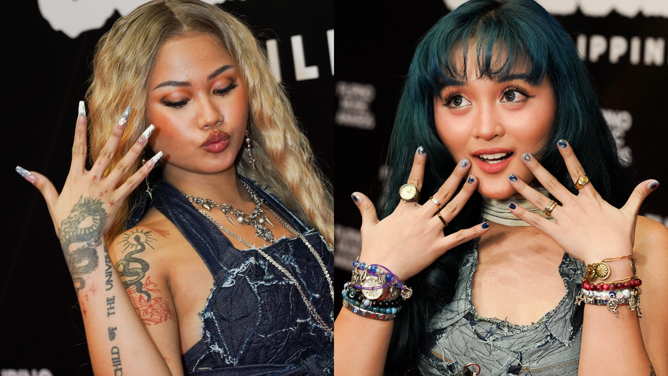 Rapper Zae showed off long white-and-blue nails with an embossed design that perfectly matched her denim-and-silver ensemble, while singer Angela Ken went for silver-and-blue celestial nails that complemented her icy blue hair. The vibe is cool, confident, and undeniably fun.