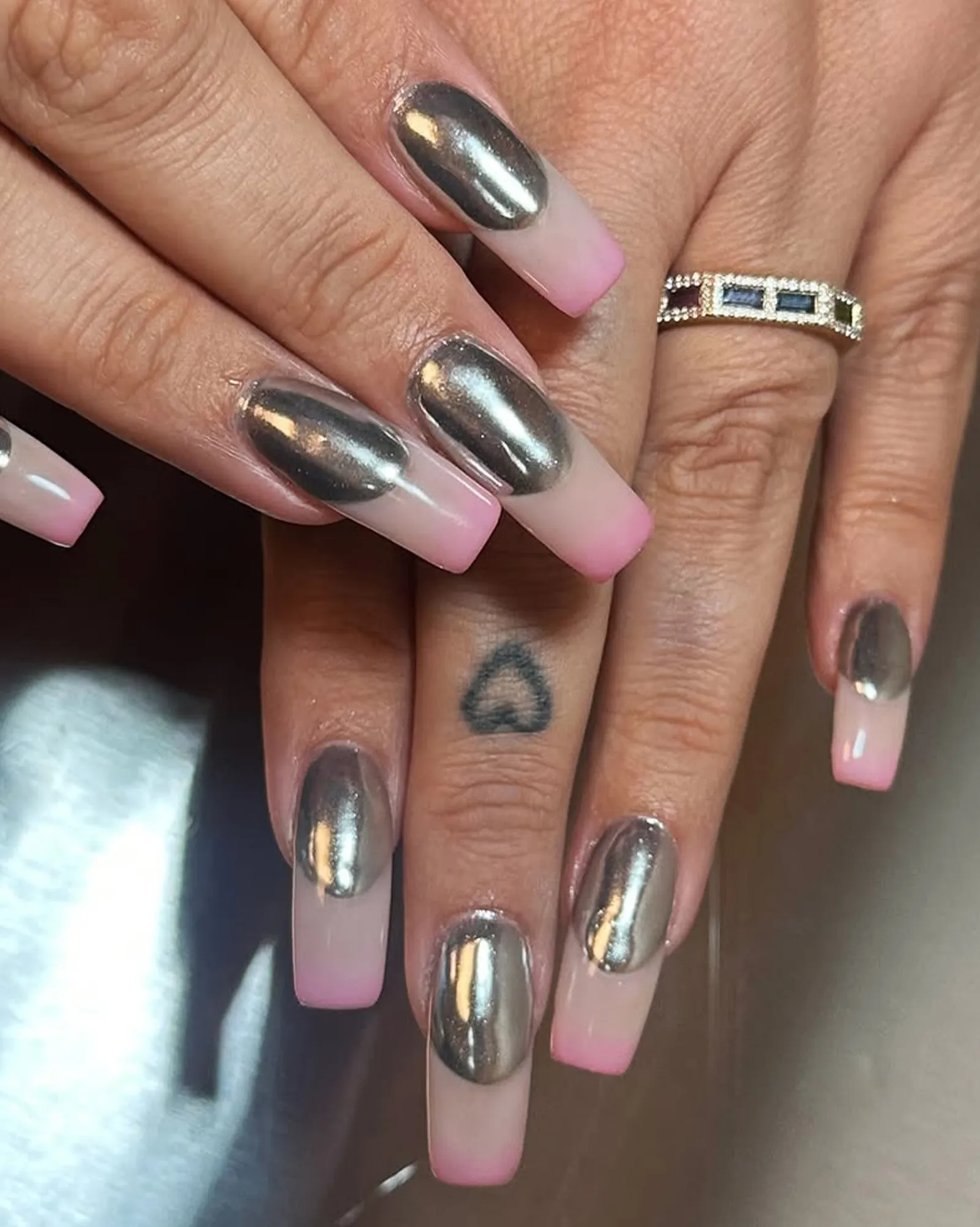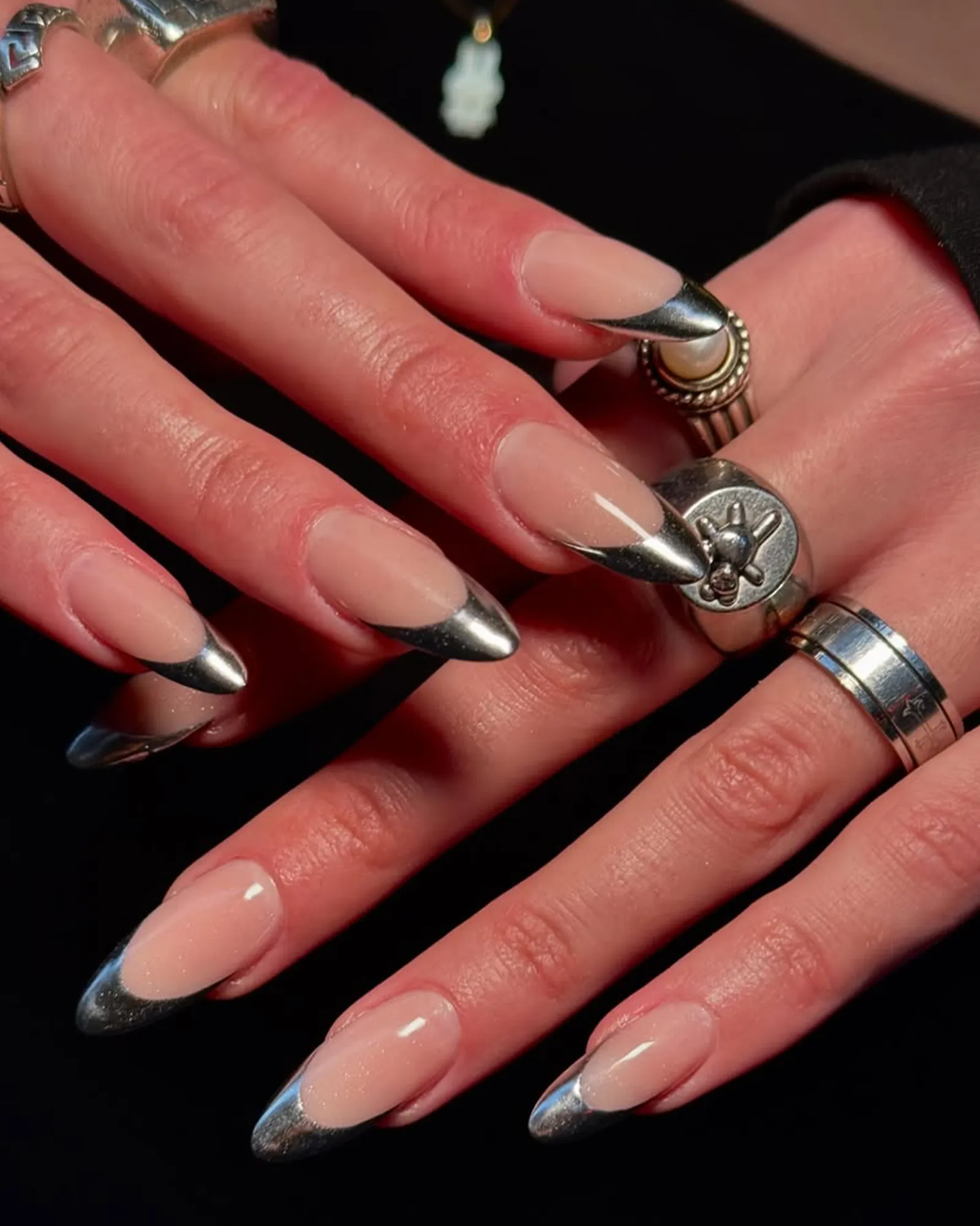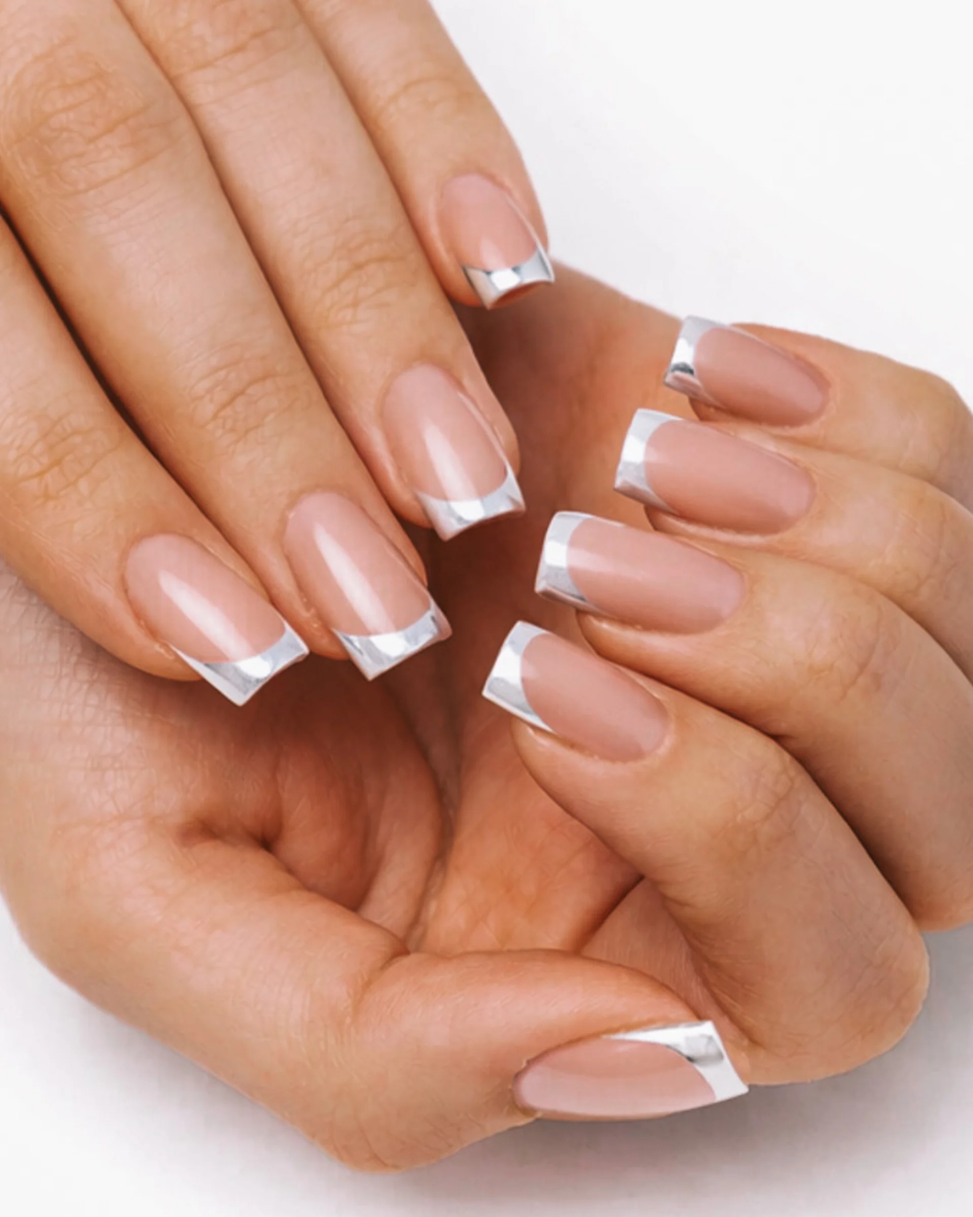Maybe it was Hailey Bieber’s glazed donut nail moment in 2022 or Y2K nostalgia, but using chrome powders on top of nail art has remained a strong trend. The metallic French is a way to use the finish that feels less indulgent than an all-over glaze, while still being a sweet treat.