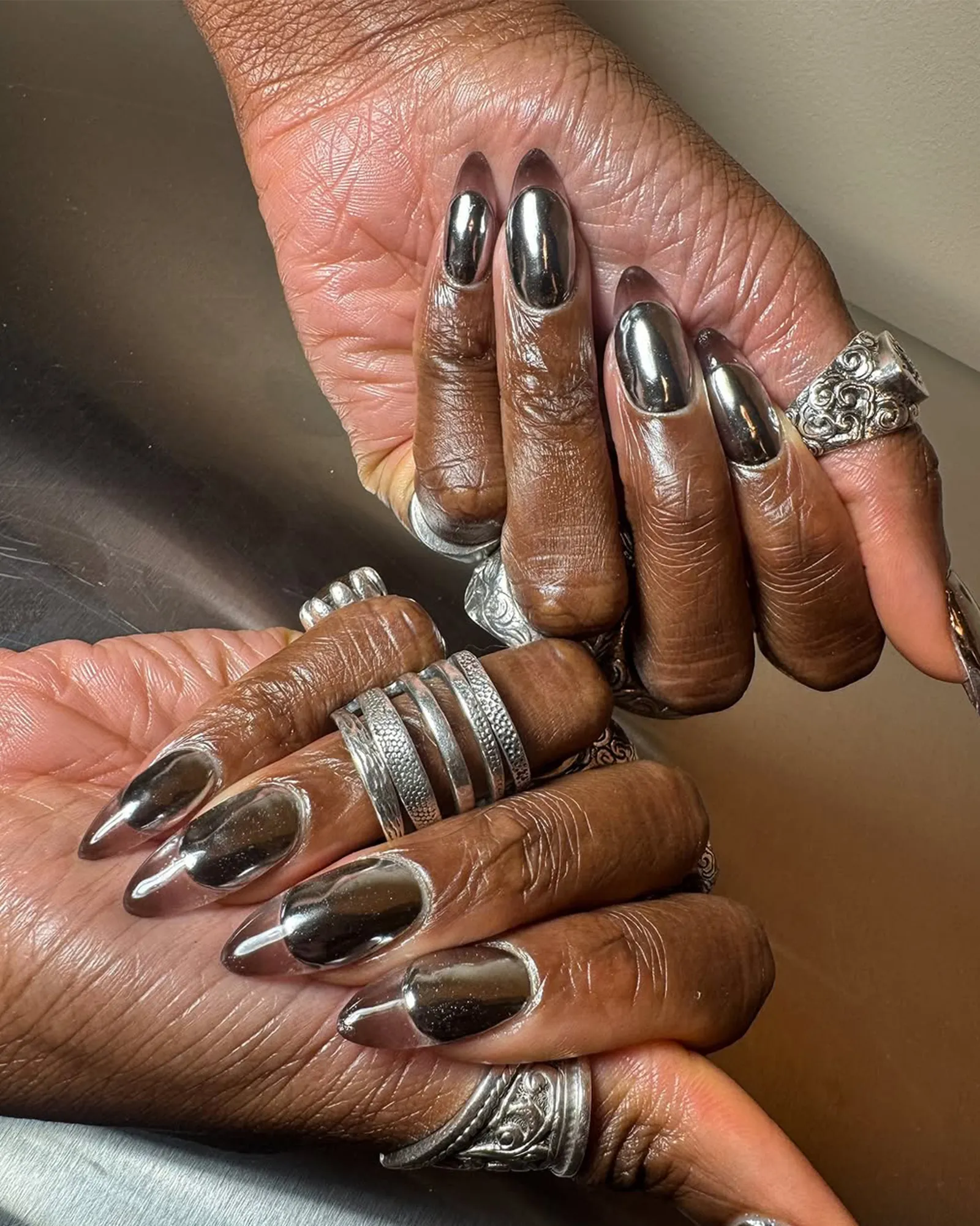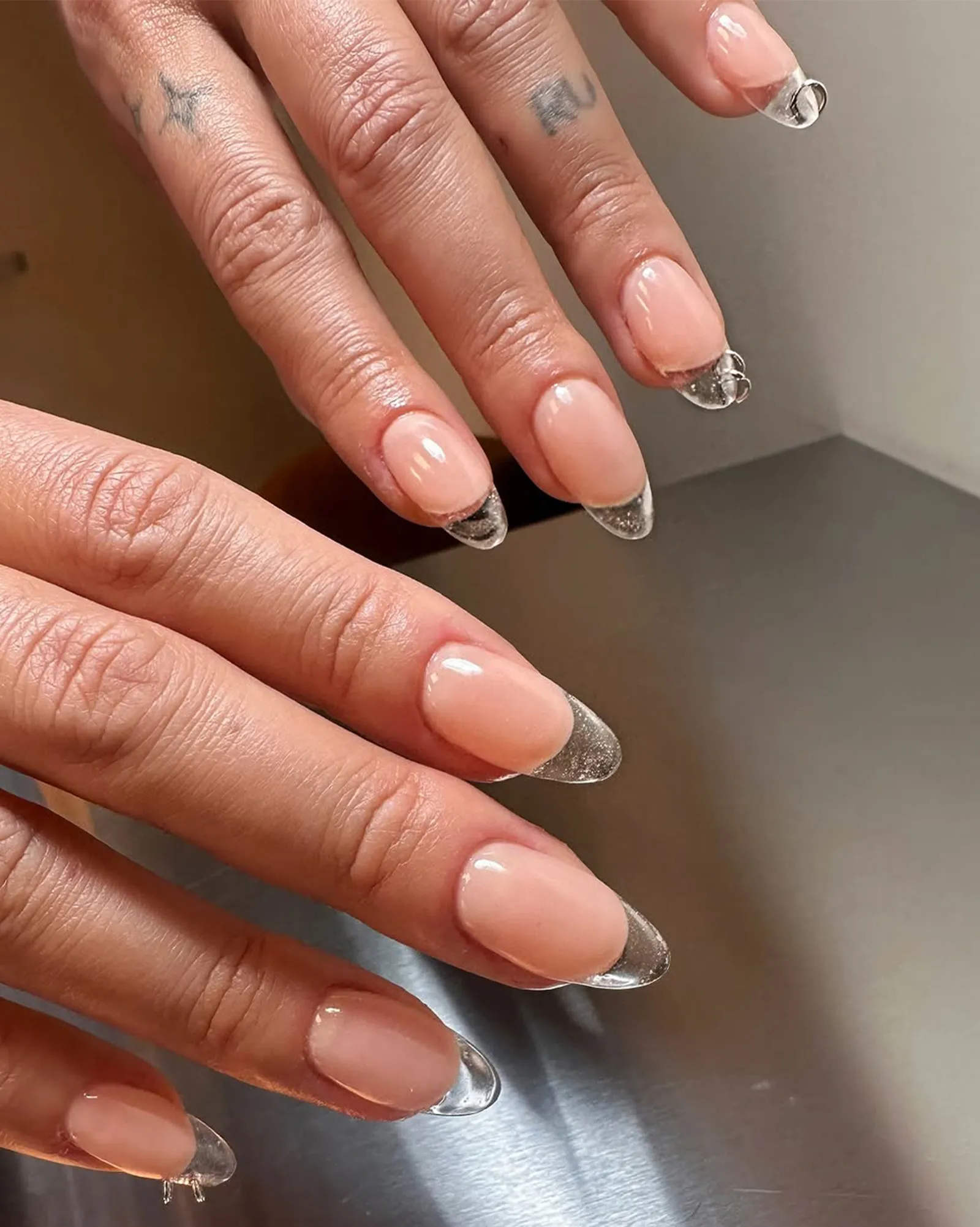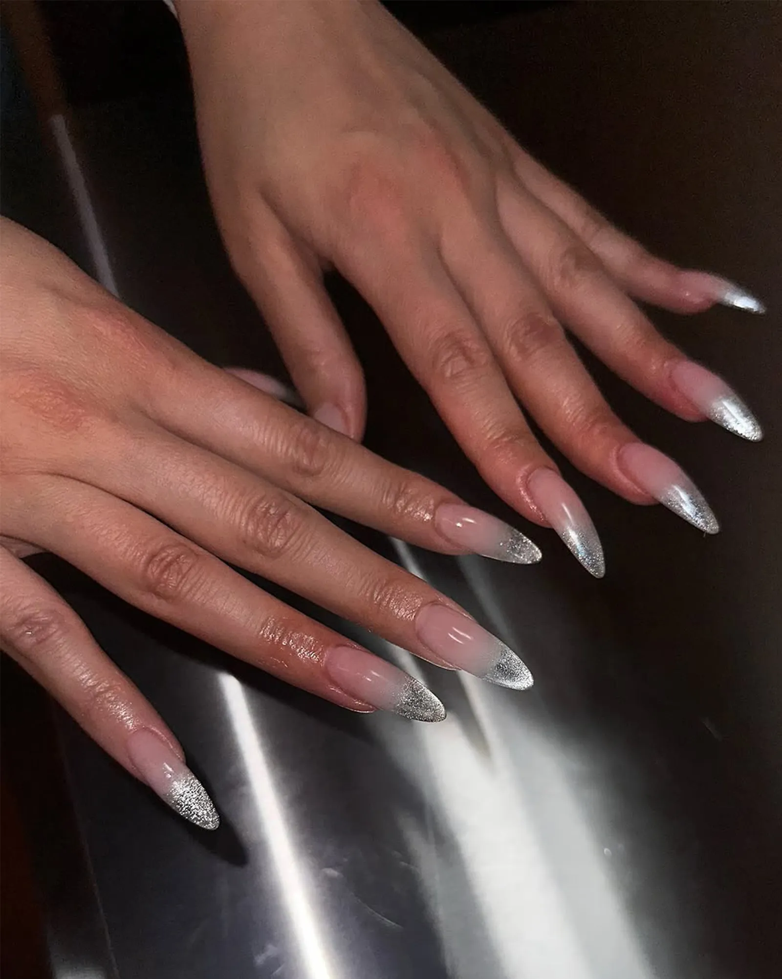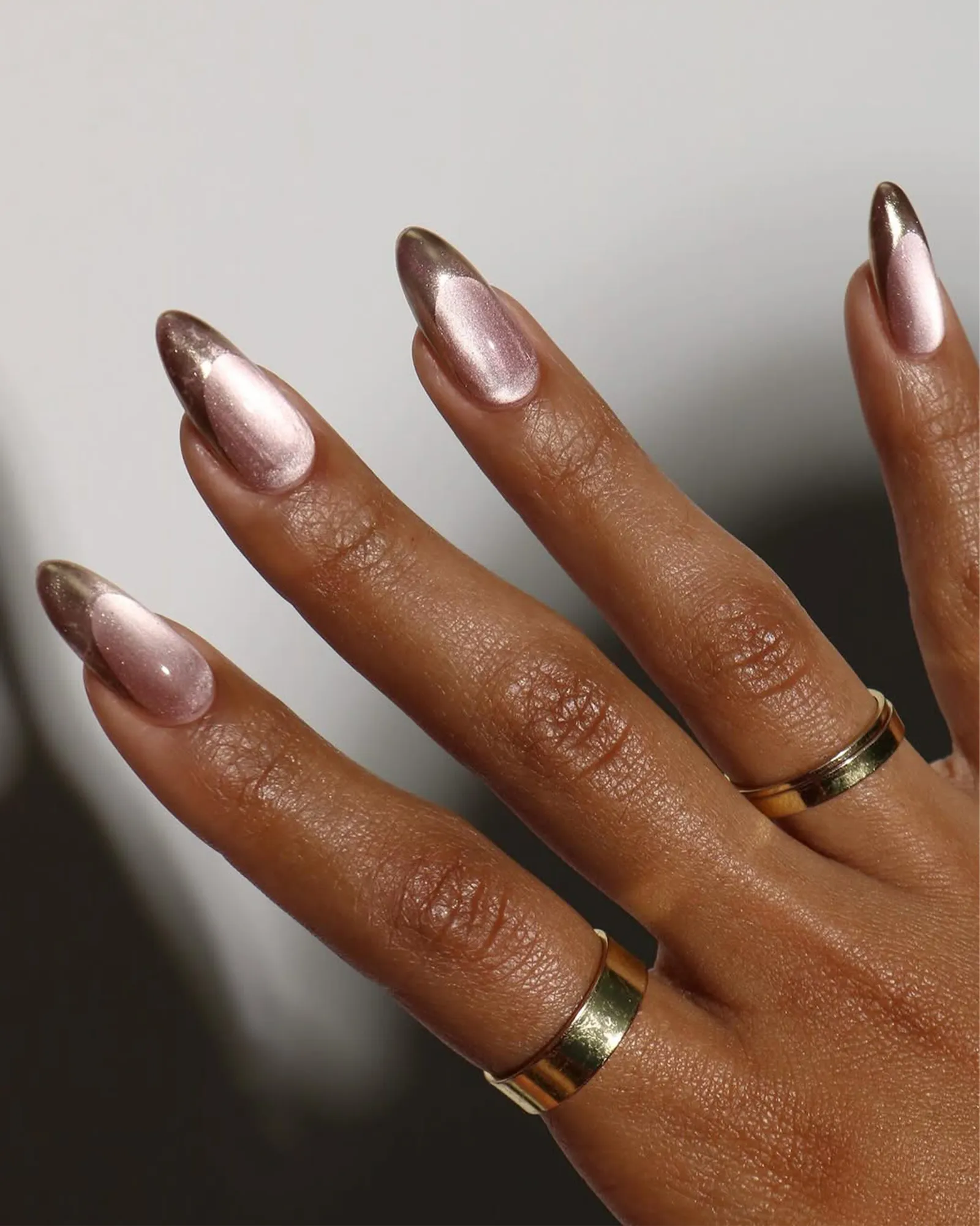 Maybe it was Hailey Bieber’s glazed donut nail moment in 2022 or Y2K nostalgia, but using chrome powders on top of nail art has remained a strong trend. The metallic French is a way to use the finish that feels less indulgent than an all-over glaze, while still being a sweet treat.