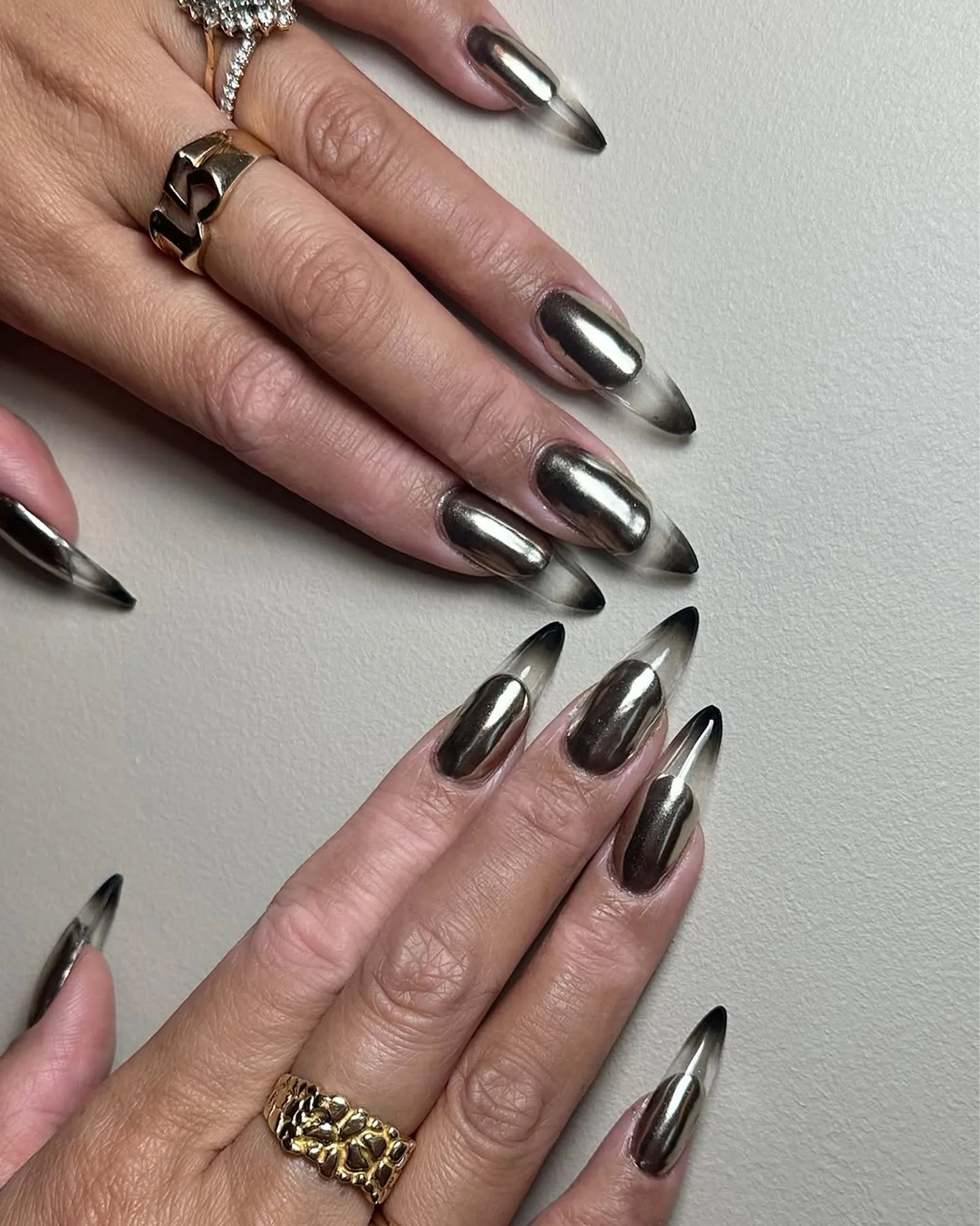 Nail artist Mei Kawajiri, known for her maximalist approach, went full-send on creating the look pictured above. She paired a velvet base (made with sheer, gray-blue gel polish and a silver magnetic polish) with a glossy black tip.
