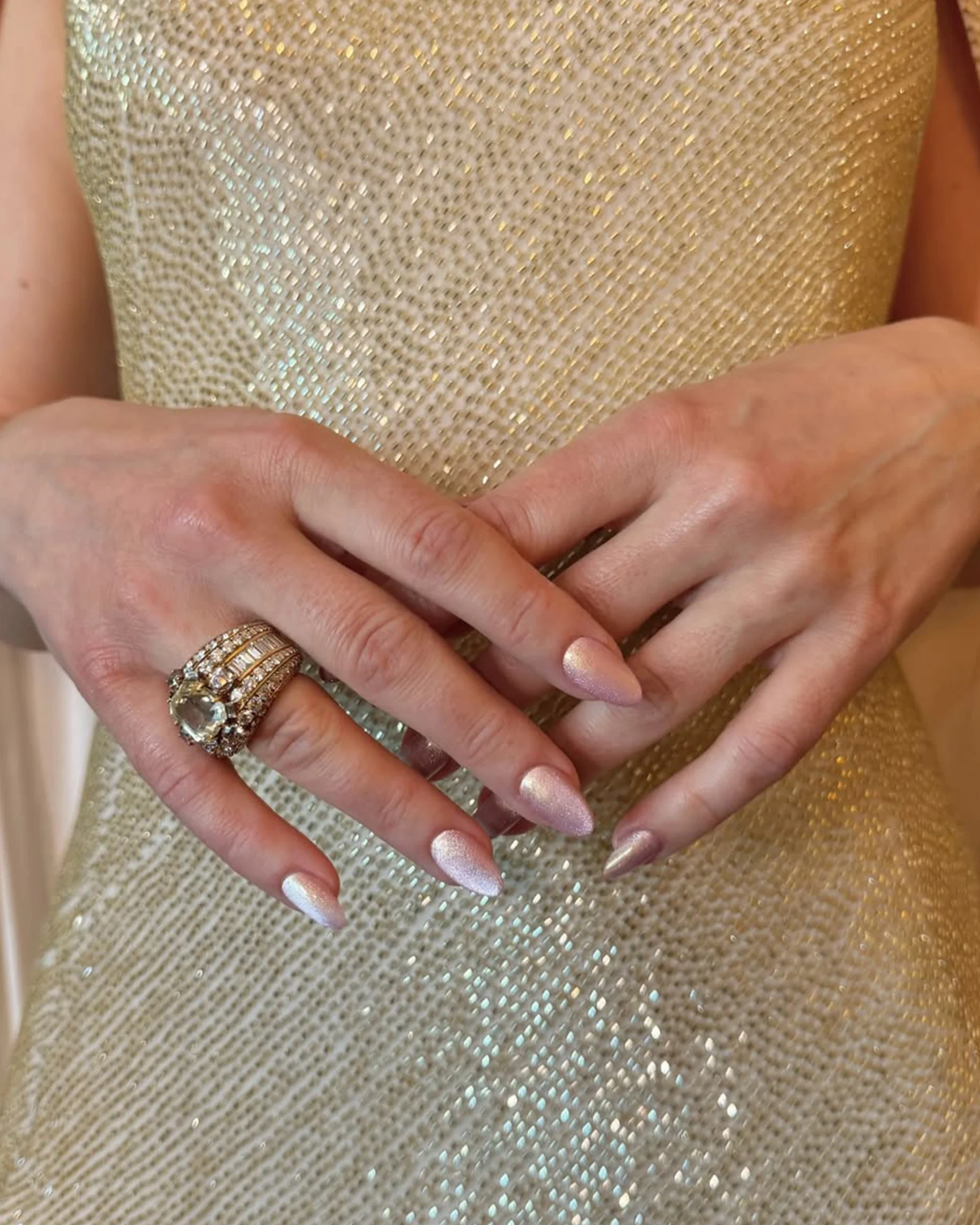 We don’t just wear pink on Wednesdays, we wear it on Oscars Sunday too. Actor and presenter for the night, Rachel McAdams donned a dusky rose, pearlescent manicure with a magnetic finish against her gold Alberta Ferretti dress––and the contrast was intentional. Nail artist Julie Kandalec said “that was the perfect color to stand out just a bit against the gown.”