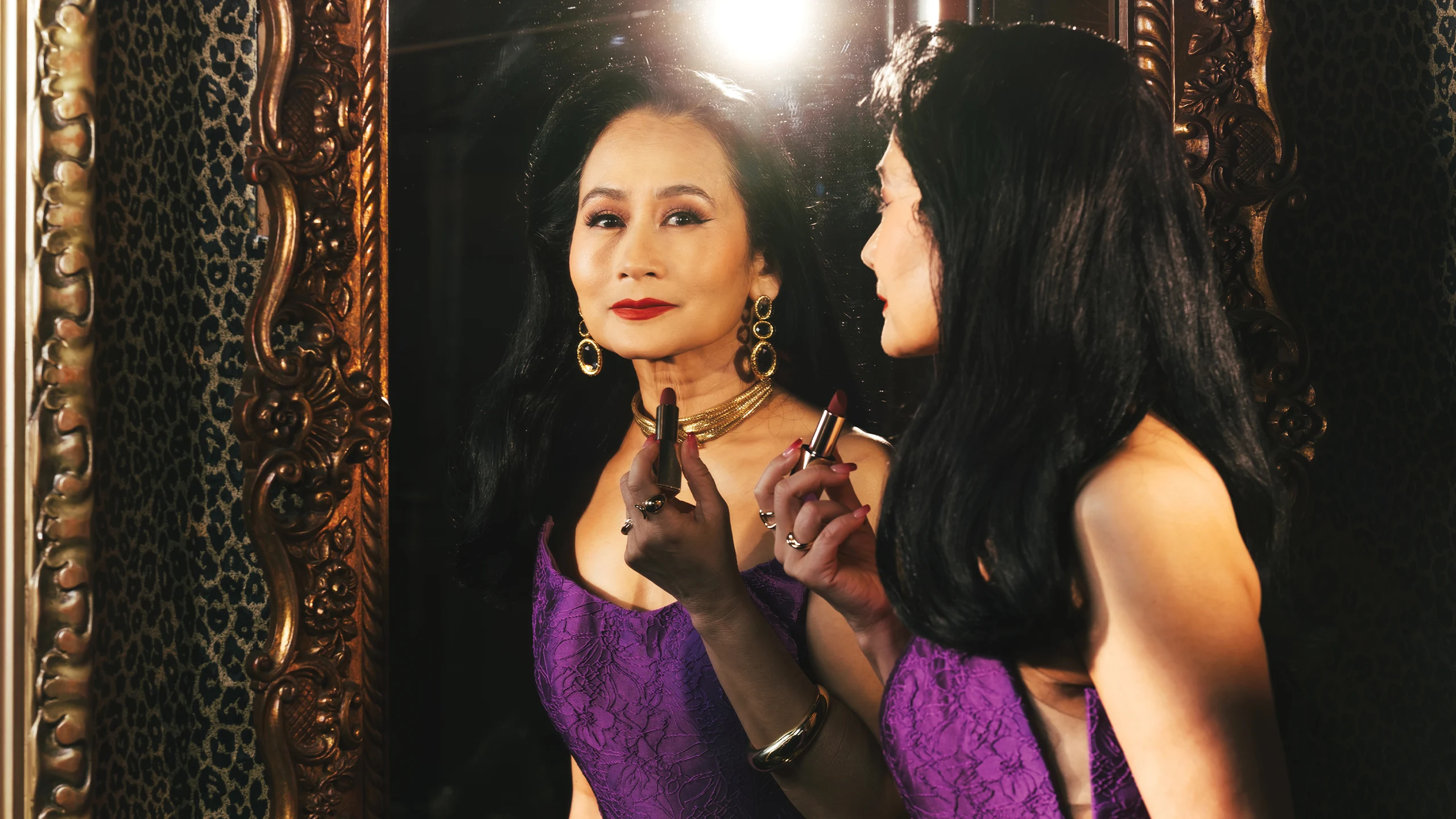 Makeup artist Gery Penaso captured Macuja Elizalde’s timelessness with a winged eyeliner and a classic red lip, subtly overlined for the illusion of a fuller pout. For soft curls that move, hairstylist Lourd Ramos blended wet wax with argan oil.