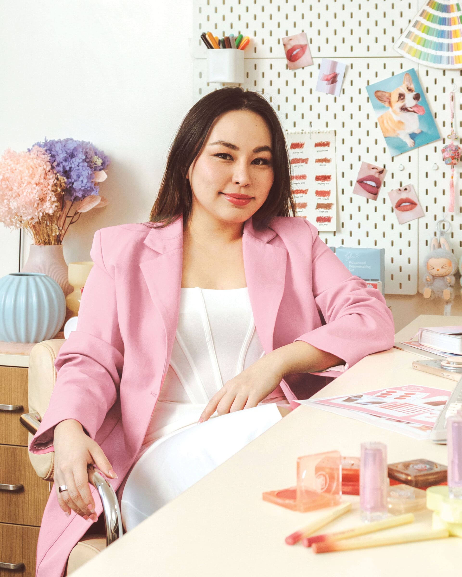 Denice is posing for the Allure Philippines camera in a hot pink blazer and white dress. She moves around her predominantly baby pink and white office with ease. Her space is accented in all manner of girly touches—a furry, pink heart-shaped throw pillow here, a little stuffed corgi there, and even a doll encased in a clear, protective box, and outfitted in, most tellingly, a fuschia pantsuit strikingly similar to her blazer. Everything is youthful and fun and fresh—not unlike the vibes that Denice herself gives off, nor the direction that Ever Bilena is taking today.