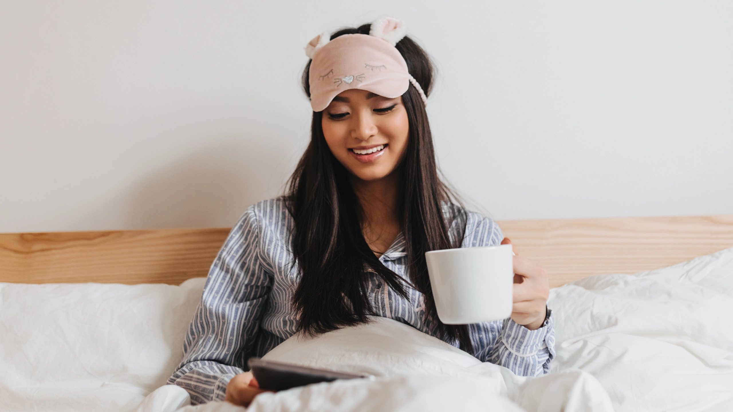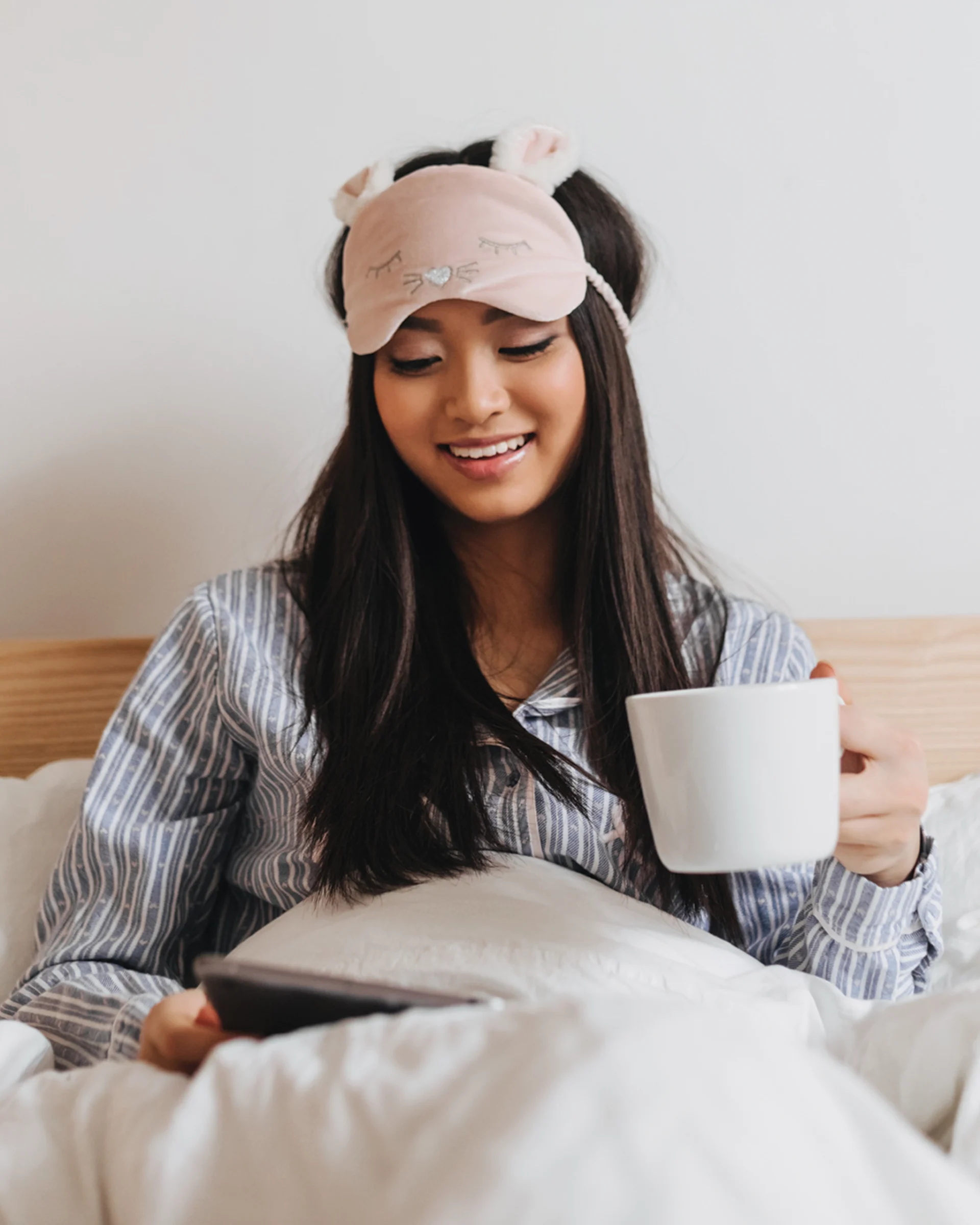 When she’s ready to put down her book and start to doze off, she slips on the blackout sleep mask. Her trio of accessories are “positive sleep associations”, which means she connects them to a good night’s rest. They can help improve the ability to fall and stay asleep, due in part to that emotional association. Their physical qualities help too, though: “[The mask] also, of course, blocks out all the lights so it makes it easier to sleep.” She brings it and a portable fan with her even when she’s on the road, to help make sleeping in hotel rooms easier.